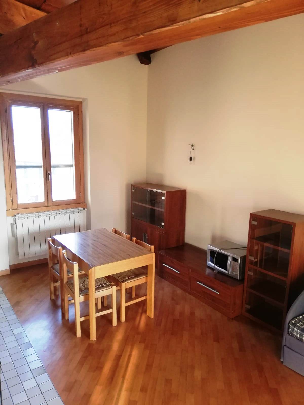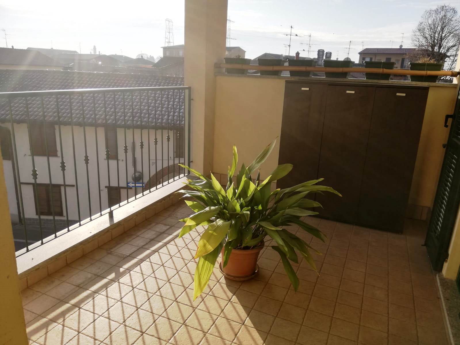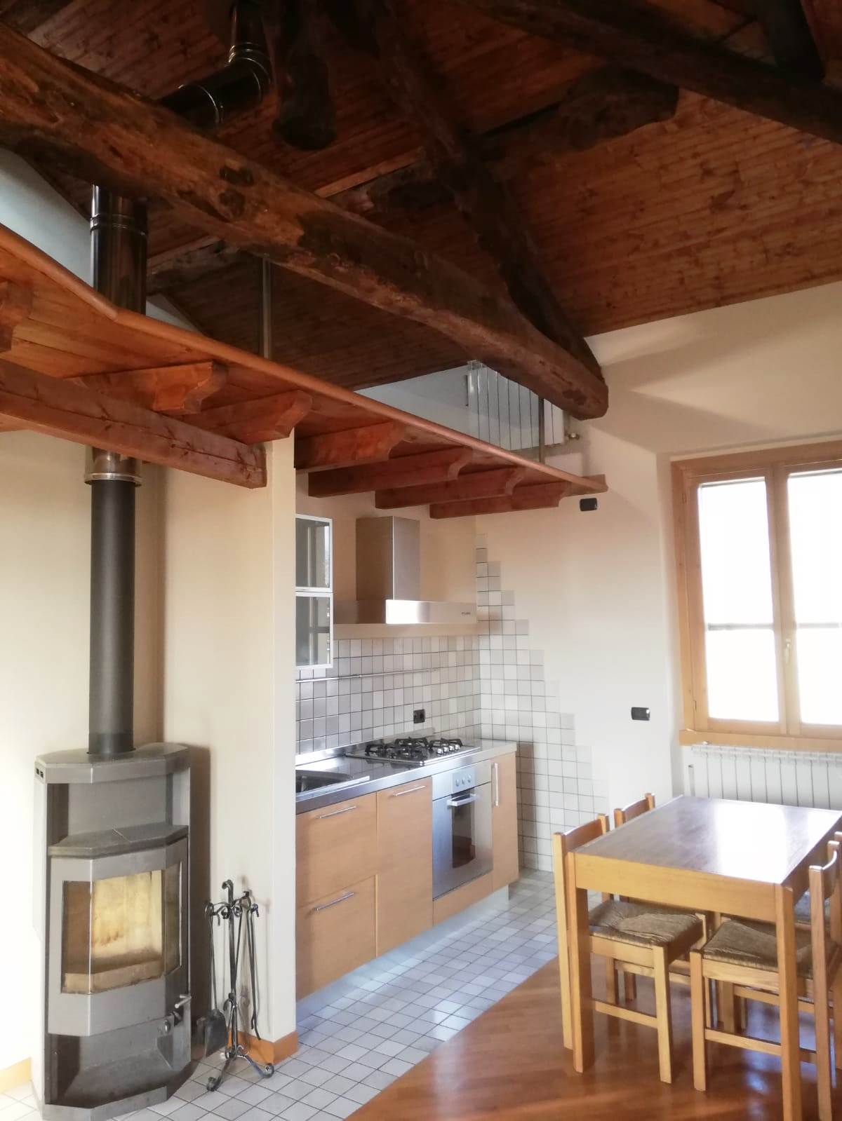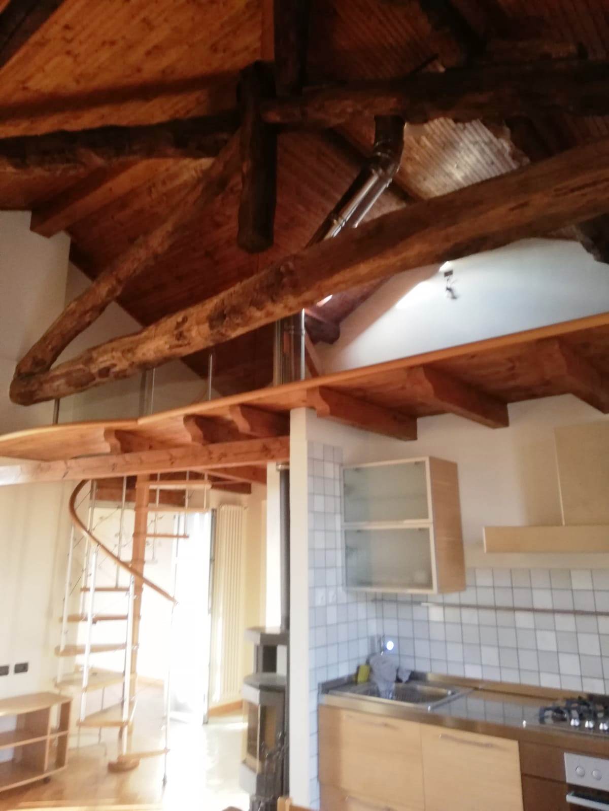 Aicurzio- Ubicata nel cuore del paese, in posizione comoda e servita da ogni genere di necessità, inserito al 2° ed ultimo piano di una graziosa mini palazzina con sole 8 unità familiari, Miranda Immobiliare propone ampio e ottimo Bilocale di circa 75 mq oltre studio e ampio Terrazzino. La particolare soluzione, caratterizzata da bellissime travi in legno a vista, è in perfette condizioni interne, ristrutturata, curata nel dettaglio e ARREDATA. Internamente così disposta: Ingresso su Soggiorno con particolare stufa a legna e Cucina a vista, aventi uscita al comodo Terrazzino di circa 12 mq, disimpegno della zona notte con Servizio finestrato e Camera matrimoniale; collegato tramite scala interna ulteriore spazio Studio/locale hobby soppalcato con vista sul living. A completare il tutto comoda Cantina Immobile assolutamente da visionare ed unico nel suo genere.